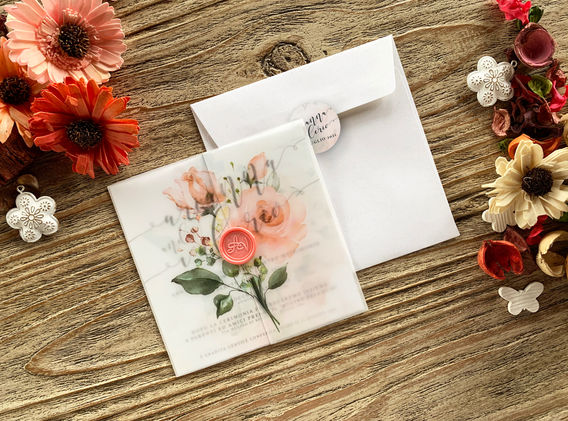 Partecipazione di nozze moderna e romantica, composta da un cartoncino inserito in un folder in carta opalina semitrasparente con stampa, chiuso con sigillo in ceralacca. A chiusura busta e tag adesiva personalizzata.