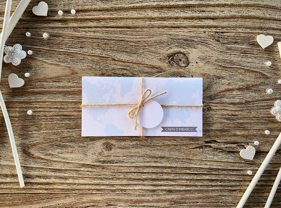 Partecipazione di nozze simpatica ed originale, composta da un porta voucher con stampa fronte e retro, al cui interno si trova un cartoncino fustellato simil biglietto aereo. A chiusura corda e tag pesonalizzata.