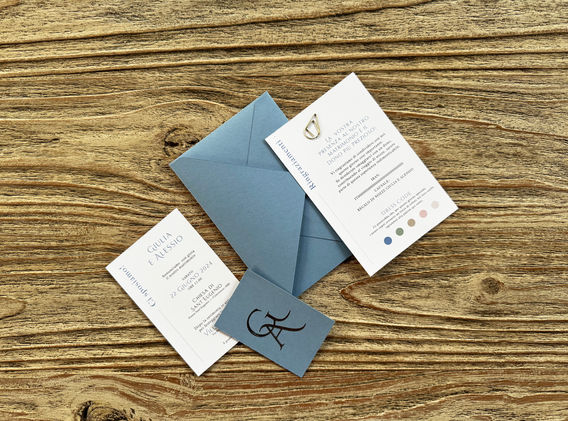 • DIMENSIONI: 12x18 cm • CARTA INTERNI: Biancoflash Master, Colorplan New Blue • BUSTA: Colorplan New Blue • Graffetta color oro a goccia • Dettagli con stampa in foil oro • Senza costi aggiuntivi di stampa • HandMade by ArTeE’