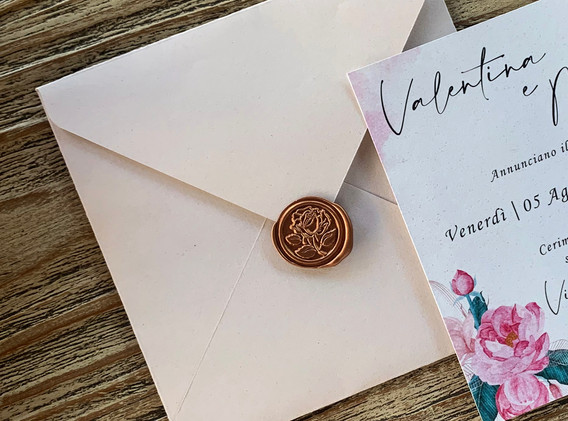 Partecipazione di nozze semplice ed essenziale, composta da un cartoncino. A chiusura busta in palette e caeralacca.