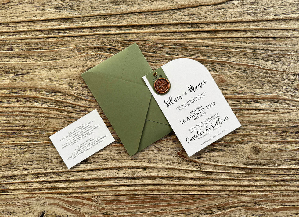 • DIMENSIONI: 12x18 cm • CARTA INTERNI: Crush Mais • BUSTA: Colorplan Mid Green • CERALACCA: Bronzo • Occhiello Oro • Senza costi aggiuntivi di stampa • HandMade by ArTeE’